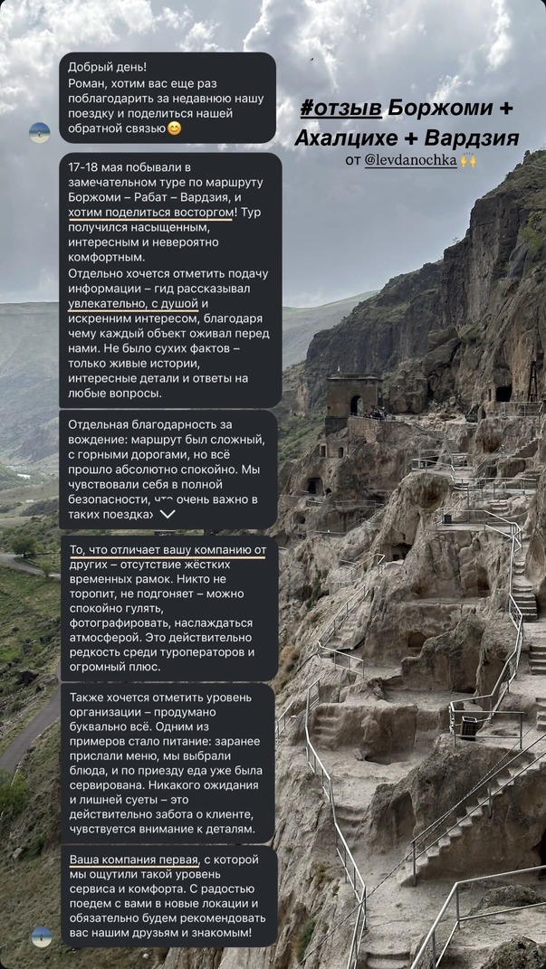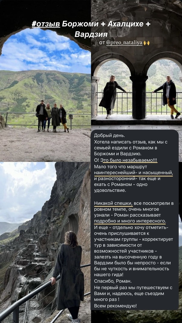 Добрый день. Хотела написать отзыв, как мы с семьей ездили с Романом в Боржоми и Вардзию. О! Это было незабываемо!!! Мало того что маршрут наинтереснейший - и насыщенный, и разносторонний- так еще и ехать с Романом – одно удовольствие. Никакой спешки, все посмотрели в ровном темпе, очень многое узнали - Роман рассказывает подробно и много интересного. И еще - отдельно хочу отметить- очень прислушивается к - участникам группы корректирует тур в зависимости от возможностей участников - залезть на высоченную году в Вардзии было бы непросто если бы не чуткость и внимательность нашего гида! Спасибо, Роман. Не первый раз мы путешествуем с Вами и, надеюсь, еще съездим много раз! Всем рекомендую!