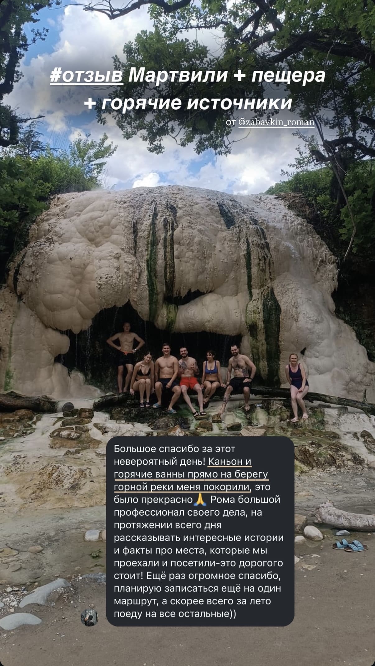 Большое спасибо за этот невероятный день! Каньон и горячие ванны прямо на берегу горной реки меня покорили, это было прекрасно! Рома большой профессионал своего дела, на протяжении всего дня рассказывать интересные истории и факты про места, которые мы проехали и посетили-это дорогого стоит! Ещё раз огромное спасибо, планирую записаться ещё на один маршрут, а скорее всего за лето поеду на все остальные))