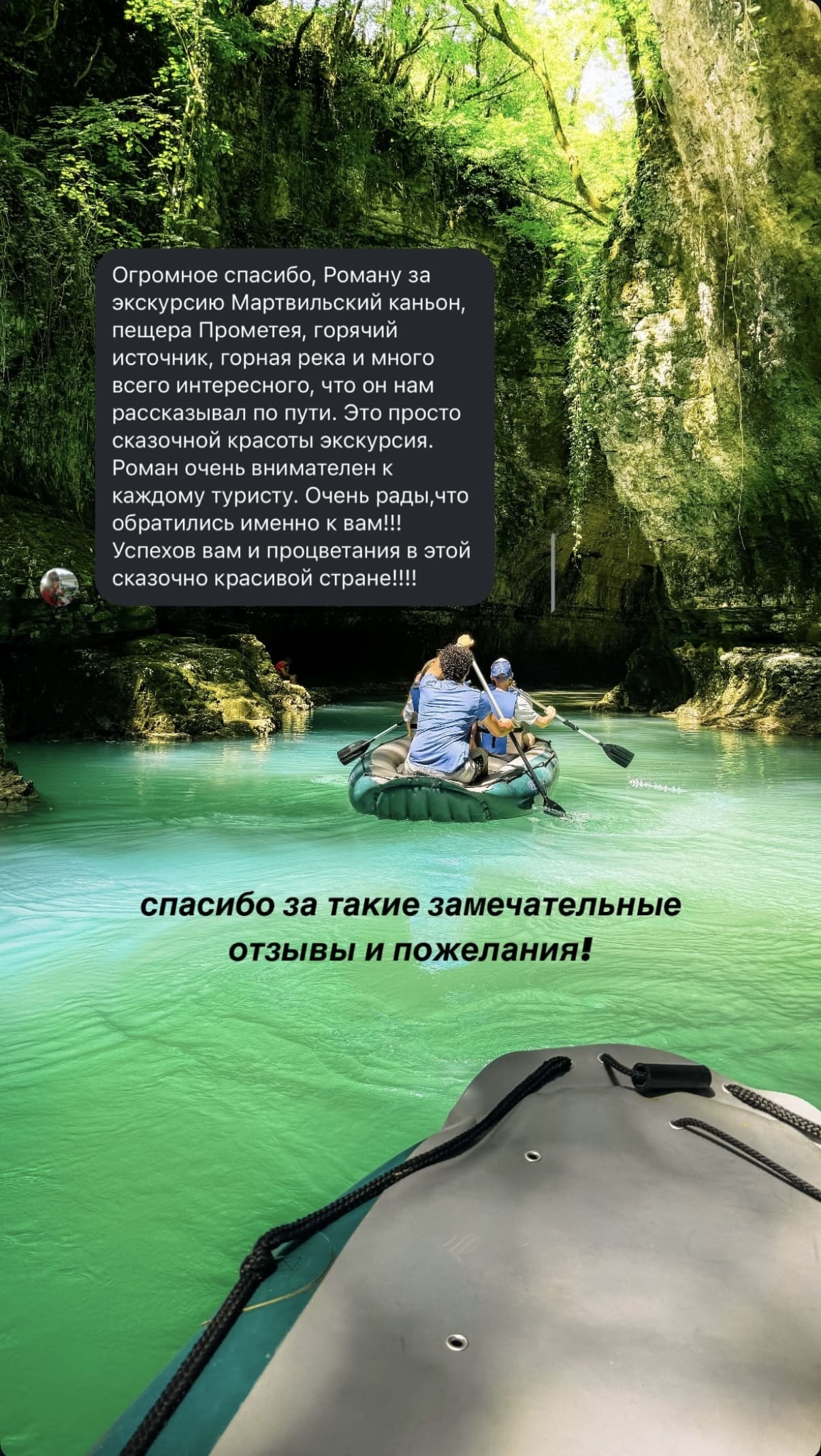 Огромное спасибо, Роману за экскурсию Мартвильский каньон, пещера Прометея, горячий источник, горная река и много всего интересного, что он нам рассказывал по пути. Это просто сказочной красоты экскурсия. Роман очень внимателен к каждому туристу. Очень рады, что обратились именно к вам!!! Успехов вам и процветания в этой сказочно красивой стране!!!!