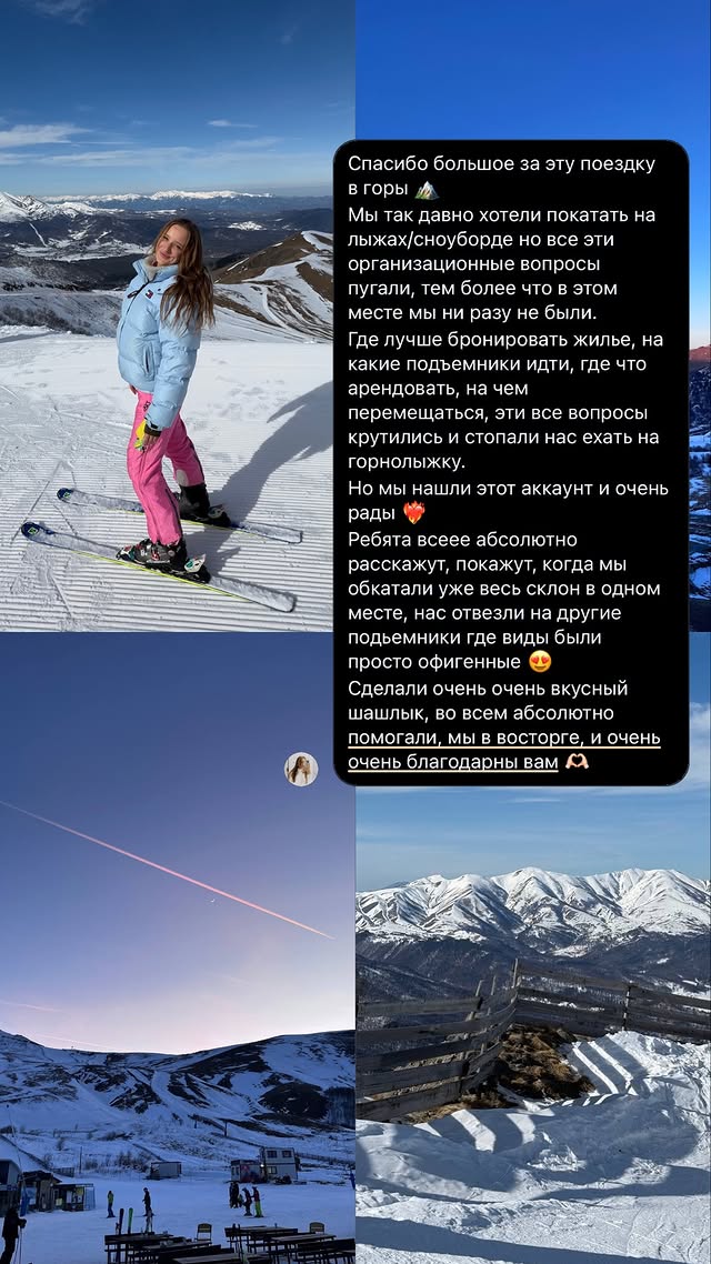 Спасибо большое за эту поездку в горы Мы так давно хотели покатать на лыжах/сноуборде но все эти организационные вопросы пугали, тем более что в этом месте мы ни разу не были. Где лучше бронировать жилье, на какие подъемники идти, где что арендовать, на чем перемещаться, эти все вопросы крутились и стопали нас ехать на горнолыжку. Но мы нашли этот аккаунт и очень рады Ребята всеее абсолютно расскажут, покажут, когда мы обкатали уже весь склон в одном месте, нас отвезли на другие подьемники где виды были просто офигенные Сделали очень очень вкусный шашлык, во всем абсолютно помогали, мы в восторге, и очень очень благодарны вам