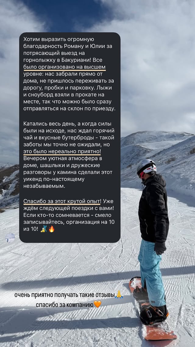 Хотим выразить огромную благодарность Роману и Юлии за потрясающий выезд на горнолыжку в Бакуриани! Все было организовано на высшем уровне: нас забрали прямо от дома, не пришлось переживать за дорогу, пробки и парковку. Лыжи и сноуборд взяли в прокате на месте, так что можно было сразу отправляться на склон по приезду. Катались весь день, а когда силы были на исходе, нас ждал горячий чай и вкусные бутерброды такой заботы мы точно не ожидали, но это было нереально приятно! Вечером уютная атмосфера в доме, шашлыки и дружеские разговоры у камина сделали этот уикенд по-настоящему незабываемым. Спасибо за этот крутой опыт! Уже ждём следующей поездки с вами! Если кто-то сомневается - смело записывайтесь, организация на 10 из 10! очень приятно получать такие отзывы, спасибо за компанию